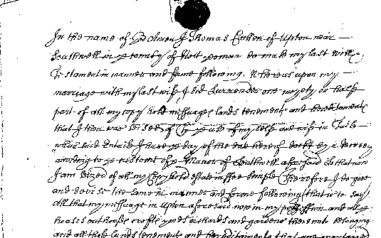 As an example of the appearance of an actual handwritten will from early 18'th century England, here is a low resolution scan of a portion of the first page of the will of Thomas Cullen. Thomas was born April 4, 1652 to Gervase and Katherine (Robinson) Cullen at Upton, Nottinghamshire. Thomas would later marry Elizabeth Bennet of Bottesford, Lincolnshire, in 1696. Thomas died April 30, 1715. The handwriting and language used in the document gives one a sense of the difficulty encountered when trying to decipher written materials from such early dates. This particular will has fared better than most in the passage of time. Thomas likely did not write or even sign his own will since, as was commonly found, literacy was not something particularly useful to a yeoman farmer. Many thanks to Cliff Cullen of New Zealand for the forwarded copy of the will of Thomas Cullen. Many thanks also to my father, James Cullen, for his amazing work in transcribing the will in its entirety. He has also provided a useful glossary that defines many of the archaic terms that appear in the will of Thomas Cullen. Further details were extracted from the book "The Rude Forefathers" by Francis H. West, as well as from various other sources. Use the links to explore the complete transcription of the will. We hope this exercise is a help to others who may try to decipher wills found for members of their own families. One will find that the language of these documents are similiar in 17'th and 18'th century England as well as on the American East Coast during the same approximate time period.