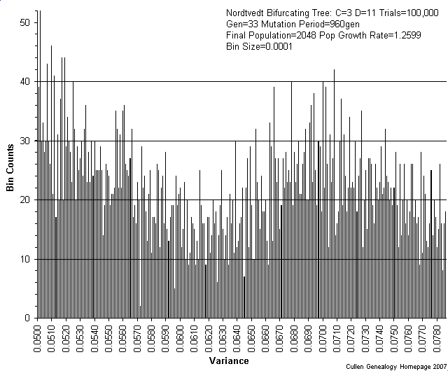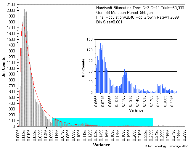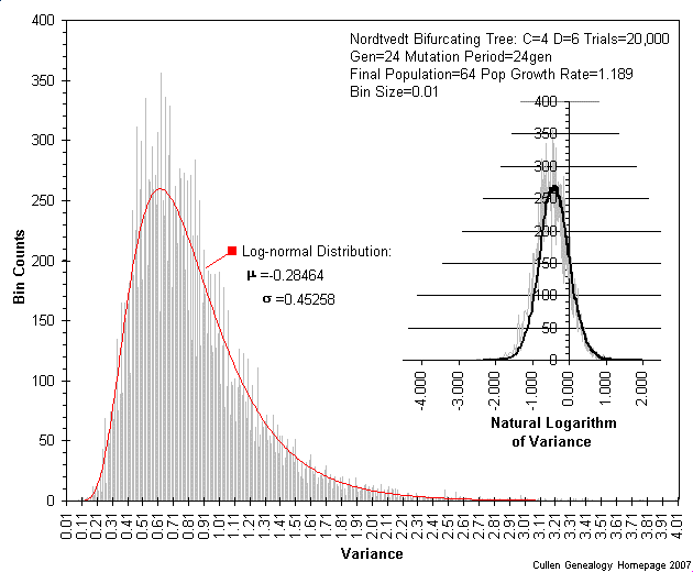 ![]() | Observed distribution of variance in 50,000 trial runs of the simulated phylogenetic tree. The derived Log-normal distribution is plotted in red. Inset graph is a higher resolution plot of the data points highlighted in turqoise in the larger plot. Note that the main distribution is composed of smaller distributions and possibly sub-distributions of these. These mini-founder events have distorted the main distribution by dragging probabilities further out on the tail, causing the derived Log-normal distribution to no longer match the data as expected. |