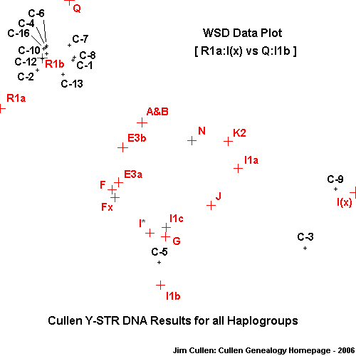 | Cullen Members: Weighted Squared Distance (WSD) from Major Haplogroups | ||||||||