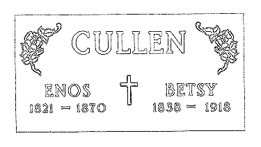 Wife: Betsy Jane James b. Apr 18, 1838 Bloomingville, Erie Co., Ohio to Henry and Abbigail (Hitchcock) James. Died Jul 28, 1918 Castalia, Erie Co., Ohio. Obit. Buried in Castalia Cemetary next to Enos but there was no stone there for her or even an indication of where she was buried. Due to the research the families have carried out, this has been corrected. Recently, the Matter family had another marker for Enos & Betsy Cullen's grave placed next to the old gravestone (which is broken and barely legible). Finally Enos & Betsy have been given proper recognition through the efforts of the families and the cemetary officials in Castalia, Ohio. We will be forever grateful for the kindness shown by the Matter family and all others involved. Below is a scan of what the new stone looks like.