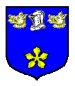 Azure, an esquire's helmet Argent, between in chief two boars' heads erased and in base a cinquefoil Or.