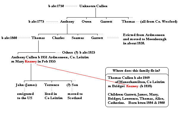 What this all comes down to is, allegedly, two branches of this one Cullen family in Co Leitrim - the Catholics around Glenfarne and the Protestants around Manorhamilton. Despite the oral history which suggests this scenario, it's been difficult to find support for it anywhere else. The "Lost Line" depicted below seems to be the correct family but uncertainty is still great and the research continues. Any help you can provide would be much appreciated.