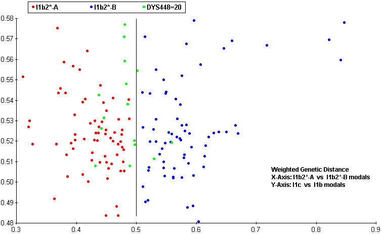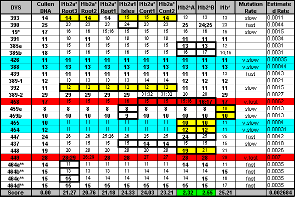 The data given was: DYS393=13, DYS390=25, DYS19=15 DYS391=11, DYS385a,b=13,17 DYS439=11, DYS389i=12, DYS392=11 DYS389ii=27, DYS437=15, DYS438=10 Across the world's haplogroups, the sample scores an average of 50.36 with a min/max range of (19.36-100.63). The score that stands out is Haplogroup I, Ix specifically, with a score of 6.86 J scored 23.39 : I* scored 19.36 : G scored 32.76 I1a scored 23.78 : I1b scored 27.68 : I1c scored 66.46 These are the old naming conventions but it's clear that the data prefers the haplogroups closer to the root of Haplogroup I. Inspection of the markers and simple genetic distance supports this. I then ran the same data through a second 'predictor', specifically for Haplogroup I and its subclades, according to Ken Nordtvedt's naming conventions. This scale is also relative and, since it spans Haplo-I and its subclades specifically, is a separate scale from that given above. Across Haplo-I subclades, the sample scores an average of 33.3 with a min/max range of (17.04-103.63). The two scores that stand out are I1b2*-A with a score of 6.86 and I1b2*-B with a score of 5.82 Again the data prefers subclades closer to the root of the haplogroup, scoring in the area of about 17 for them. I1b* scores 17.26 and I1b1*-Isles2 scores 17.17 which was expected since I1b2* and I1b1*-Isles2 have some similar mutational characteristics to I1b*. The lower score for the B variety of I1b2* should be taken with a grain of salt. DYS385b is the main reason for the lower score but there just isn't enough data to make that call. The scaling system is weighted so additional markers could cause the final scores to drift but I am satisfied, due to good score separation, that the Haplo-I subclade for this data is I1b2* Jim Cullen |